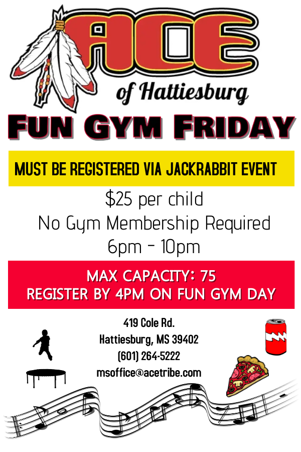 - Walk-Ins: ACE of Hattiesburg will not take walk-ins for Fun Gym at this time. You must be registered for the event prior to 4pm on the day of the Fun Gym Event.